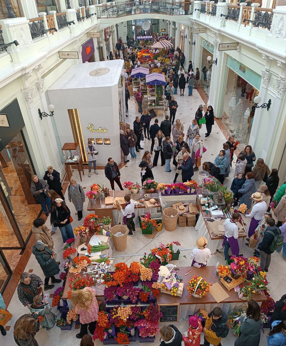 12 марта 2025 года Здравствуйте, друзья! Петровский Пассаж и ЦУМ находятся совсем рядом, на одной улице, буквально в двух шагах друг от друга. Это не те магазины, куда посетители вроде нас, средне-пенсионерского класса ходят за покупками. Про ЦУМ известно, что там "всё очень дорого", а Пассаж вообще остаётся для меня какой-то "Зоной", которую если кто и посещает, то это "сталкеры". Но 8-го марта всё было по-другому. На первом этаже одной из линий расположилась ярмарка цветов, которая и собрала значительное количество посетителей. Цветы продавали, цветами любовались, цветы фотографировали. И цены на букеты были примерно на уровне средних. Ну, почти. Впрочем про цветы я уже рассказывала, а кто пропустил, в конце будет ссылка. Но отдав должное тюльпановому многоцветью, всё же захотелось пройтись и мимо других витрин и посмотреть, что там предложено вниманию посетителей. А там с прошлого нашего посещения ничего не изменилось. Всё те же идеально оформленные витрины, всё те же скучающие ма