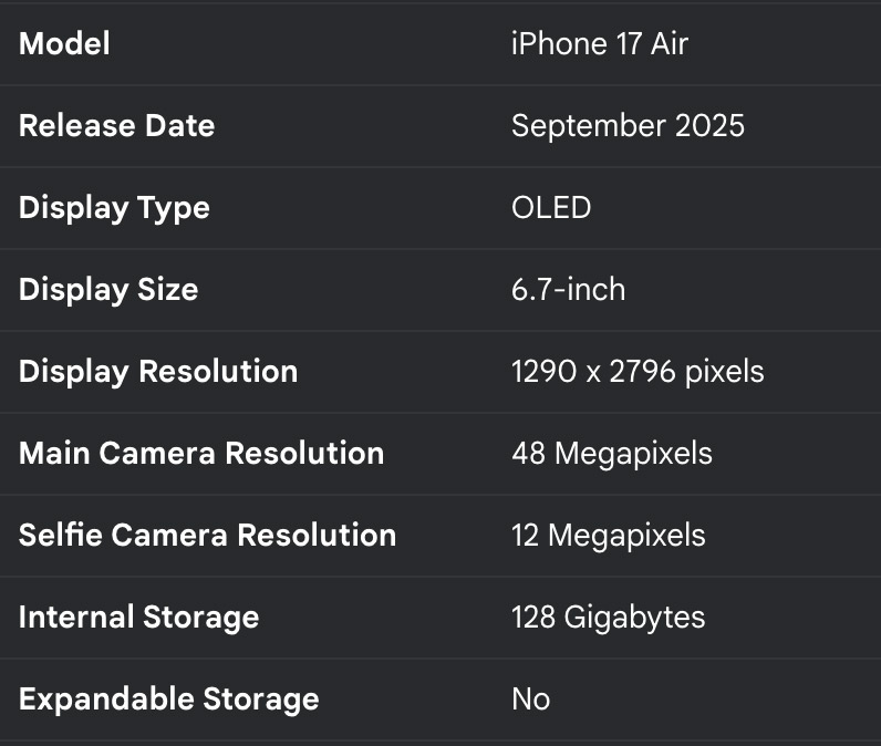 В сеть утекли подробности о дисплее, камере и памяти iPhone 17 Air
