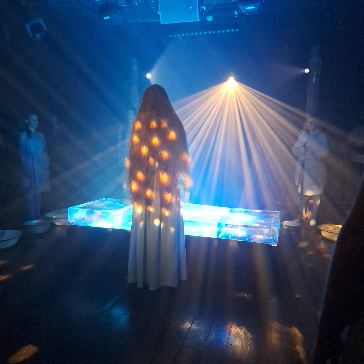 Я много каких театральных форм видела, но спектакля, подобному постановке "Мороз, Красный нос" в Театре «Практика» пока не встречала. Спектакль - опера - путешествие - это если вкратце. Как я понимаю, спектакль показывают очень редко, возможно даже раз в год, подбирая так дату, чтоб сошлись в одной точке Масленица, конец зимы, начало весны и 8 марта. Мне, как это ни странно, ведь спектакль поставлен по поэме Николая Некрасова "Мороз, Красный нос", увиделся какой-то женский обряд, женское камлание, призывание весны и обновление природы. Хотя содержание поэмы Некрасова сохранено почти полностью и смерть там есть и "есть женщины в русских селениях" с из трудной долей... Спектакль начинается как только вы заходите в театр, который уже преобразился к приходу гостей: полумрак и только несколько лампочек выглядывает из-под неструганных досок, которыми закрыт весь пол. Кругом стволы деревьев. Разговаривать нельзя, даже встречающий на входе общается со зрителями исключительно жестами. Все а
