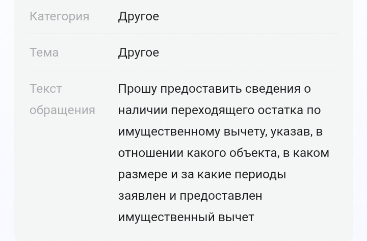 Приветствую вас на моем канале. Недавно я писал, что подал дополнительную заявку на налоговый вычет. Первый я уже получил. А пока ждал справки из детских секций, решил узнать, сколько я могу ещё запросить имущественного вычета. В этом легко запутаться, так как получал я его частями на протяжении нескольких лет. Да ещё и за разные квартиры. Думал, что там остались какие-то копейки, и решил уточнить. А оказалось, что совсем ни копейки. В комментариях меня спросили, а как сделать такой запрос? И я решил написать это в отдельной статье, может кому-то будет полезно. Я и сам нашел этот способ в интернете, но я думаю, лишним не будет повторить. Итак, заходите в свой личный кабинет налогоплательщика. Я думаю, вы знаете, как это сделать. Далее войдите в "Каталог обращений". И выберите "Прочие обращения". В перечне выберите "Заявление в свободной форме". Далее, выберите ваш регион, и вашу налоговую инспекцию. Дальше выбираете категорию "Другое" и тему "Другое". А в поле "Ваше бращение" введите: