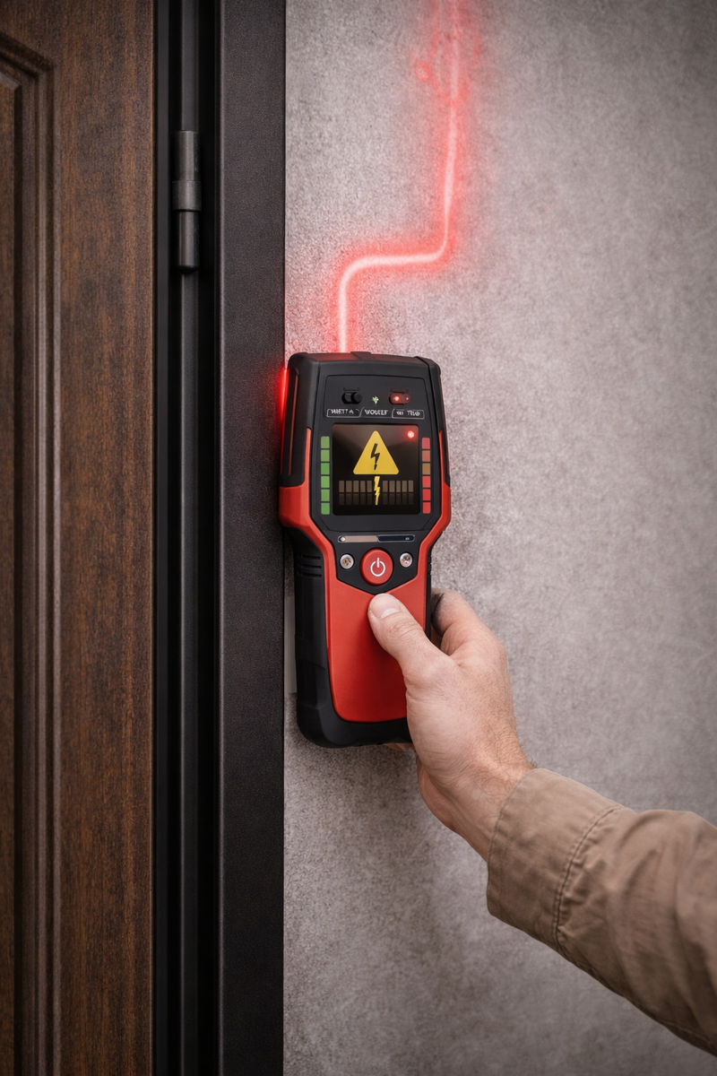 ◉ Электродетектор работает по принципу индукции — он способен обнаруживать электрические поля, которые создаются проводами под напряжением. Некоторые электродетекторы могут найти проводку на глубине до нескольких сантиметров в стенах, поэтому использование этого устройства минимизирует риски при ремонте.