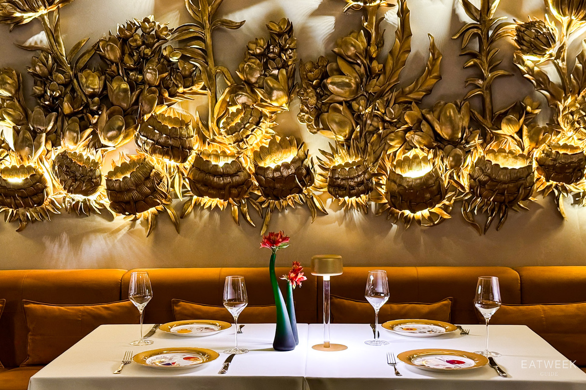 Особое внимание обращает на себя золотое панно с изображением артишоков и полевых цветов работы студии современного барельефа Леонида Кима.