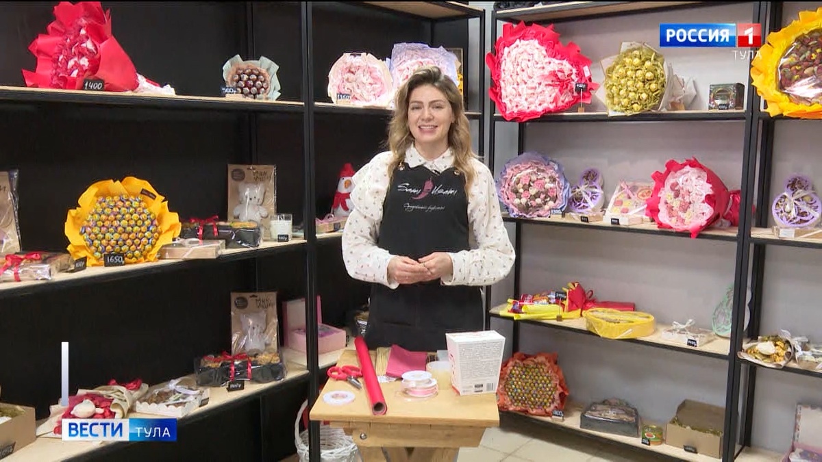 Тульские фуд-флористы считают, что идеальный букет должен быть в первую очередь съедобным и вкусным. А наполнить его могут орехи, цветы из бельгийского шоколада и даже чупа-чупсы. Как соорудить чудо-букет, расскажет Ксения Камерилова, фуд-флорист. Как известно: лучший подарок – сделанный своими руками. Для этого нам потребуется лист пенопласта – небольшой кусочек можно взять, бумага тишью. Если её нет – ничего страшного, можно без нее сделать, упаковка шпажек деревянных 25 см, скотч, ножницы, двухсторонний скотч, тоже нам потребуется, лента любого цвета, какая у вас есть, и какие-то конфеты. Из квадрата мы делаем круг: обрезаем немного уголочки, чтобы сформировать форму для букета. С помощью двухстороннего ножа или ножниц мы обрезаем уголки. Далее мы оборачиваем нашу заготовку бумагу тишью, чтобы было красиво и эстетично. Если бумаги тишью у вас нет, можно использовать любую другую бумагу, которая есть дома. Отрезаем от него кусочек небольшой, ну по размеру нашей заготовки, приблизител