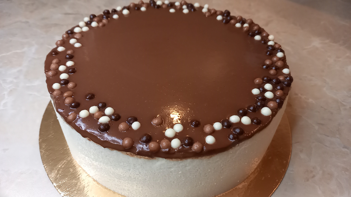 Думала-гадала, какой бы сделать тортик на 8 марта, чтобы порадовать себя и окружающих, перебрала свои и чужие рецепты и остановилась на этом. Печь не хотелось, поэтому сделала торт без бисквитной основы: суфле и сверху тоненький слой шоколадного ганаша. Получилось изумительно! Легко, просто и очень вкусно! Диаметр торта 19 см, высота 5,5 см Делала в разъемной высокой форме, вниз положила подложку для тортов. Желатин залить холодной водой и дать ему набухнуть. Размягченное сливочное масло взбить, постепенно добавить порциями сгущенку и снова взбить в пышный крем. Крем отставить в сторону(но не в холодильник) и сварить сахарный сироп. Для этого сахар и ванильный сахар с водой довести до кипения и варить на небольшом огне в течение 5 минут. Если у вас есть кулинарный термометр, то можно измерить им(температура сиропа должна достичь 110-115°). Пока закипает сироп, нужно взбить белки с щепоткой соли, лимонной кислотой или лимонным соком до мягких пиков Затем по краю миски тонкой струйко