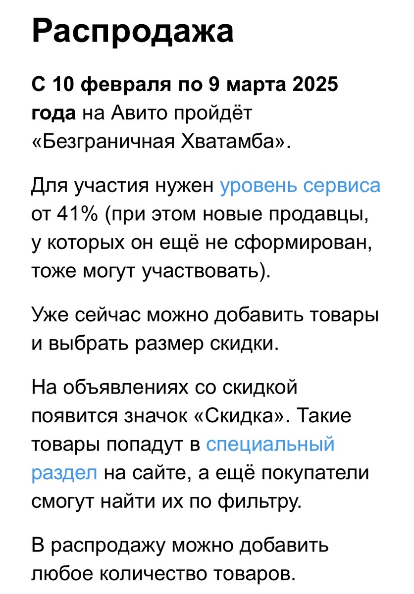Всем привет 👋 Вчера был последний день распродажи от Авито . Хватамба закончилась ! Распродажа длилась ровно месяц, с 10 февраля до 9 марта . С самого первого дня я подключилась к ней , сделала скидку на некоторые товары в размере 5 , 10 и 20 % В основном это были книги, одежда и долговисы из других категорий. Что могу сказать, мой опыт , как и в прошлые разы , оказался положительным) С самого первого дня Хватамбы были заказы именно лотов со скидкой , да и вчера, в последний день , тоже люди успевали заказывать , пока скидки) Последний заказ на лот со скидкой пришел вчера около 12 ночи , буквально в последние минуты. Результат меня порадовал ! Реально ушло много долговисов благодаря скидке ) Буду ли еще участвовать ? Конечно буду ))) Как только объявили о начале распродажи, я стала выкладывать новые лоты с завышенной ценой, специально , чтобы потом сделать скидку и продать по той цене , что было бы мне комфортно) А так же, частично удаляла старые объявления , делал