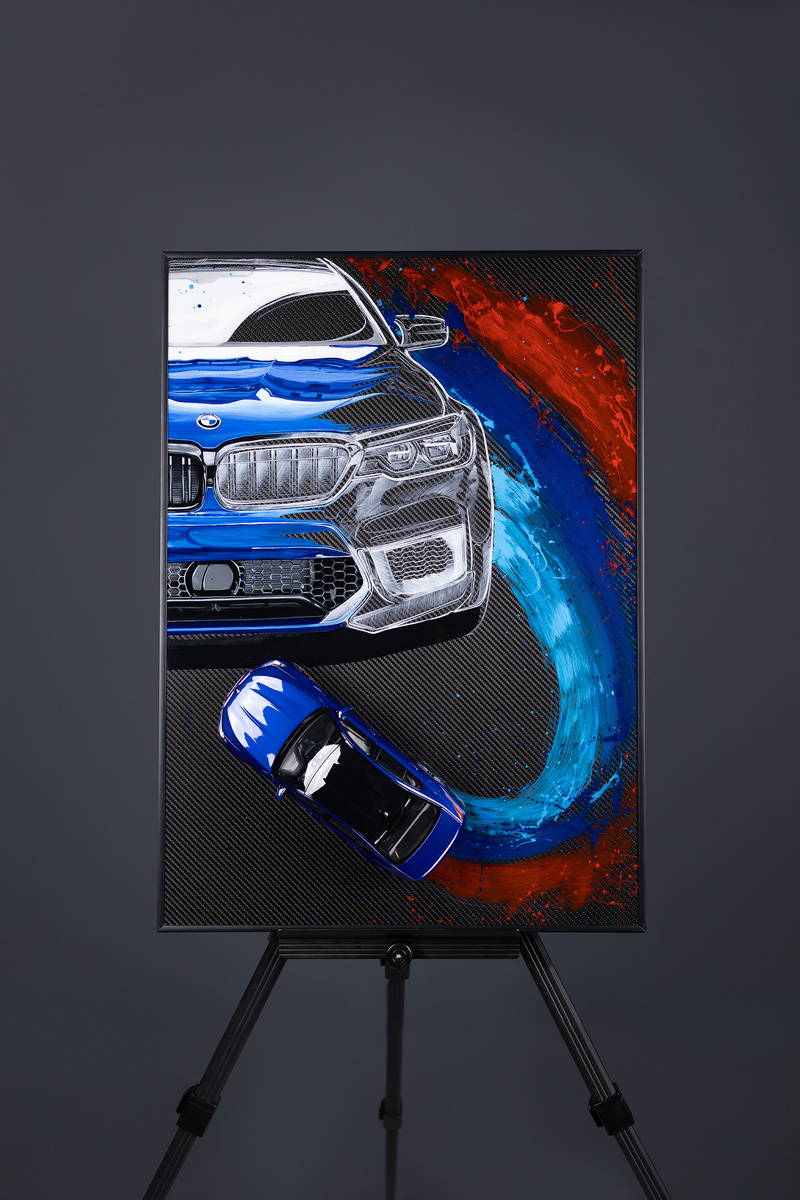 Когда технологии и творчество объединяются, рождаются произведения, которые вызывают эмоции. Эта серия картин на карбоне — не просто изображения автомобилей, а уникальные арт-объекты, созданные из объемных элементов и авторской росписи. Картины передают энергию скорости, сочетают в себе реалистичные образы и абстрактные элементы, создавая эффект движения и глубины. Детали автомобилей прорисованы с точностью, а текстуры и материалы добавляют эксклюзивности и фактурности. Машина буквально выходит за пределы карбонового холста, что создаёт более динамичный пространственный образ всей работы. Словно она проехала по цветам логотипа и только что остановилась перед нами. Материалы премиального уровня Основа — карбоновый холст, который подчеркивает связь с автоспортом и современными технологиями. Эффектные мазки краски создают ощущение движения, а сочетание глянцевых и матовых поверхностей делает каждую работу неповторимой. Для кого эта серия? Эти картины идеально подойдут владельцам BMW, колл