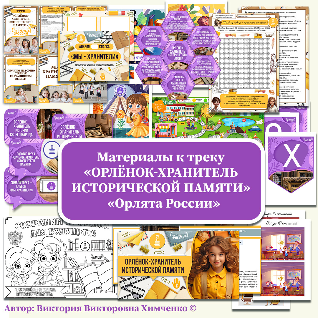 Представляю вашему вниманию большую подборку моих материалов к треку «Орлёнок-Хранитель исторической памяти», программы «Орлята России». Нажимайте на выделенные ссылки, чтобы скачать актуальный для вас материал. 1. Речевые облачка трек «Орлёнок-Хранитель исторической памяти» (комплект 12 шт.) «Орлята России» 2. Растяжка "Орлёнок-Хранитель" (флажки). Внеурочная деятельность "Орлята России". Трек "Орлёнок-Хранитель исторической памяти" 3. Гексы к треку "Орлёнок-Хранитель исторической памяти". Внеурочная деятельность "Орлята России" 4. Рабочий лист на тему "Орлёнок–Хранитель исторической памяти". Орлята России. Трек "Орлёнок–Хранитель исторической памяти" 5. Рабочий лист на тему "Традиции моей страны". Орлята России. Трек "Орлёнок-Хранитель исторической памяти" 6. Пазлы к треку «Орлёнок-Хранитель исторической памяти» (в наборе 5 пазлов). «Орлята России» 7. Символ трека «Орлёнок-Хранитель исторической памяти» - альбом «Мы хранители» (комплект страниц + обложка) | «Орлята России» 8. Раск