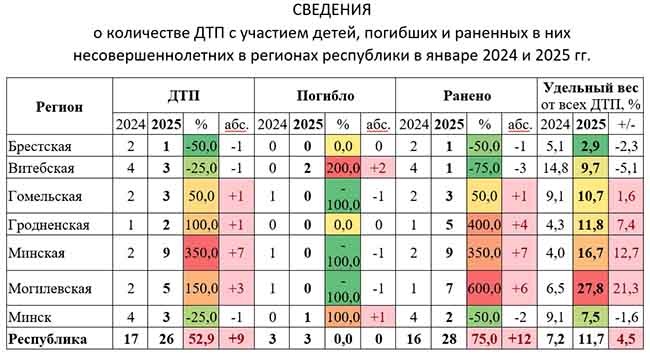 Рост составил 52,9% (с 17 до 26; +9), количество раненых несовершеннолетних увеличилось на 75% (с 16 до 28; +12). При этом число погибших в дорожных происшествиях детей осталось на уровне (3) января 2024-го. Рост отдельных показателей состояния детского дорожно-транспортного травматизма отмечен в большинстве регионов, за исключением Брестской области. ВВитебскойобласти и городе Минске увеличилось число погибших несовершеннолетних (с 0 до 2 и с 0 до 1 соответственно). Среди получивших смертельные травмы детей – 2 пешехода и 1 пассажир. В Витебской области (2): годовалая пассажир в результате опрокидывания (находилась на руках у матери) в Сенненском районе и 9-летний пешеход в результате наезда на нерегулируемом переходе в Витебске. ВМинске (1): 8-летний пешеход в результате наезда на нерегулируемом переходе. По вине водителей пострадали 29 из 31,или 93,5% детей. Большая часть (54,8%), или 17 (+9) несовершеннолетних участников дорожного движения, получила травмы в качестве пассажиров тра