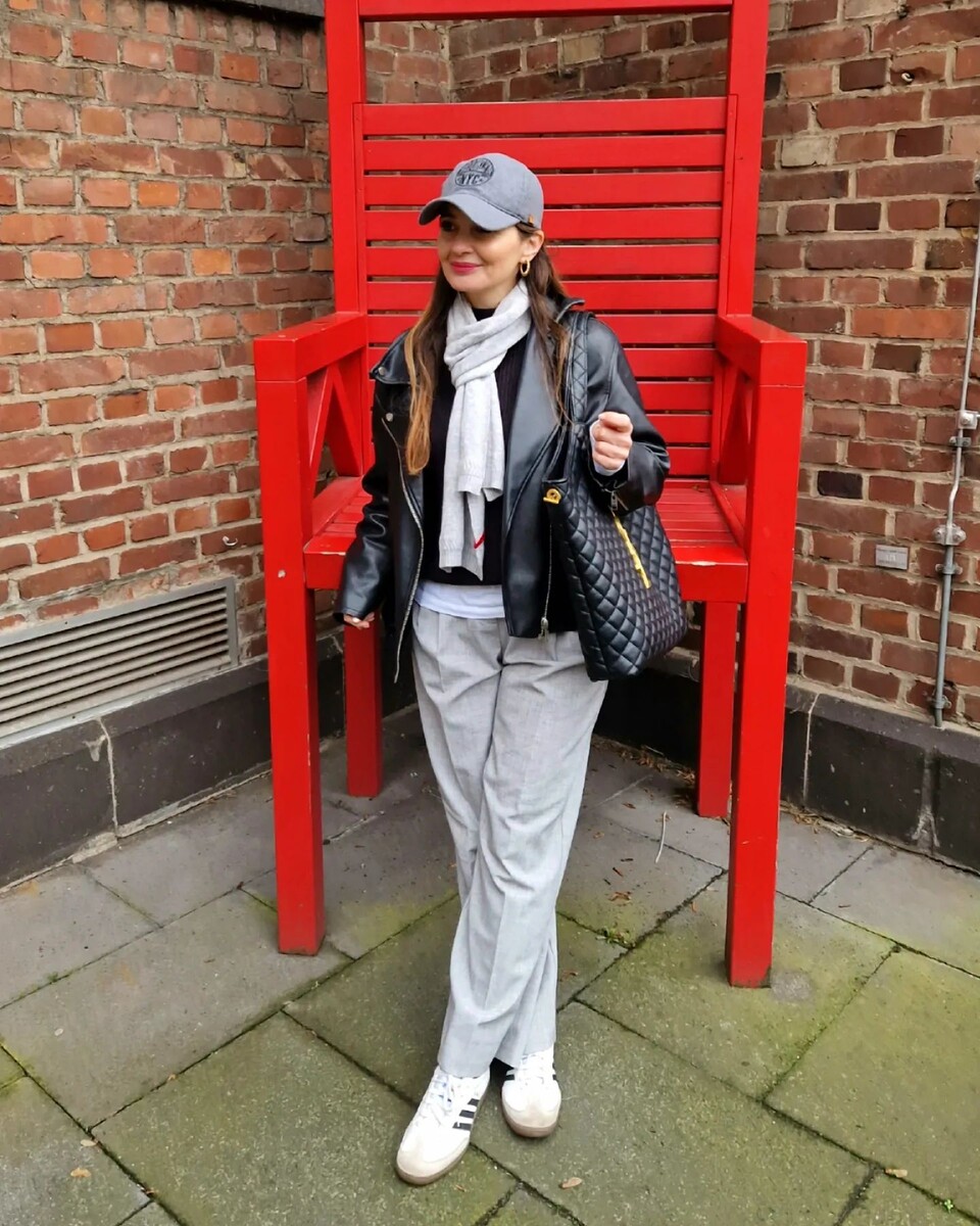 Прохладным весенним днем кожанку стоит вписать в многослойный сет. Спортивная обувь и вместительная сумка добавляют ансамблю практичности.