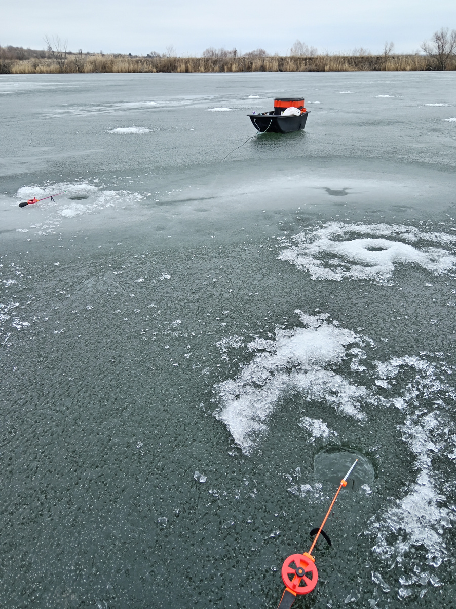 И вот заход на лёд, вода с полей талая на льду. Сверху. Иду боясь упасть в такую лужу. Пронесло удачно все вышли на лёд.
