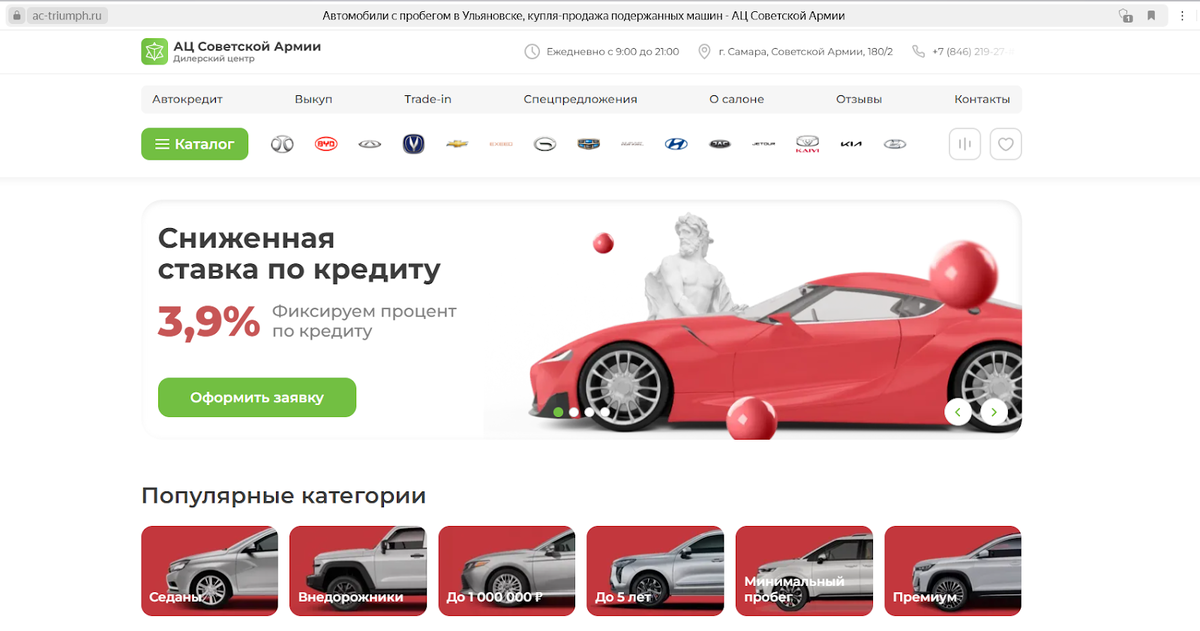 АЦ Советской Армии — это автосалон в Самаре, который недавно начал появляться в рекламе. Существует ли он на самом деле — большой вопрос, ведь его нет на картах. Возможно, это из-за того, что он недавно открылся. А может быть это просто лендинг для сбора заявок. В любом случае, он выглядит подозрительно, ведь на юрлицо, указанное в качестве владельца, много судебных исков. Больше интересных подробностей ищите в нашем обзоре. В каталоге автосалона на улице Советской армии 180/2 в Самаре, который размещен на официальном сайте дилера, представлены автомобили с пробегом. Они продаются с большими скидками — до 40%. Также покупателям обещают низкую кредитную ставку (3.9%), подарки и выгодные условия по программе Trade In. На сайте нет публичной оферты, отсутствует верифицированная информация о состоянии автомобилей и не раскрыты условия проведения акций. Поэтому у нас нет оснований верить в то, что предложения, размещенные на сайте, имеют что-то общее с реальностью. Владелец автоцентра АЦ Со