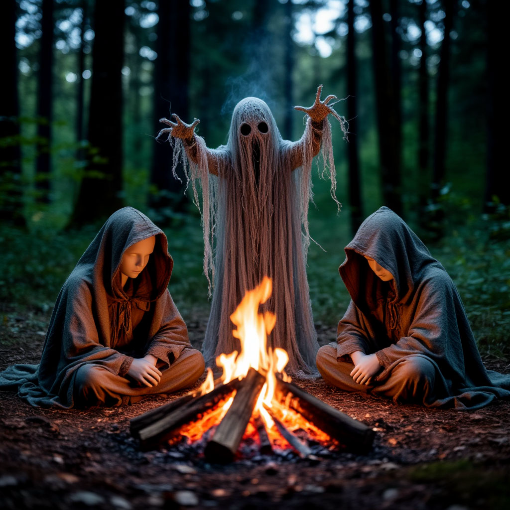 Проявился легкий свет от углей догорающего костра, возле которого в неудобной позе, сидя и сгорбившись, дремали две небольшие фигуры. Богдан шагнул было вперед, но нога остановилась в воздухе: что-то было не так, что-то происходило. Камень на его груди начал пульсировать необычно быстро, отбивая ритм сердца какого-то бегуна. Вглядевшись, он увидел полупрозрачную костлявую тварь чуть выше метра с тонкими, как у цапли ногами и куполообразной головой, которая стояла, раскинув веткообразные руки-крылья, накрывая ими сидящих у костра. Тело твари переливалось от темно-фиолетового и неприятно багрового до светло-зеленого и белого, причем края крыльев, накрывающие сидящих, светились наиболее приятным светом, создавая впечатление, что тварь пьет с них энергию и тянет из них эти цвета, либо угнетает какими-то чарами. В одном из сидящих Богдан с ужасом узнал Италлона: тот и без того серый, потемнел, как мраморная могильная плита, лицо его клонилось к земле, изо рта вытекала тягучая струйка слюны.