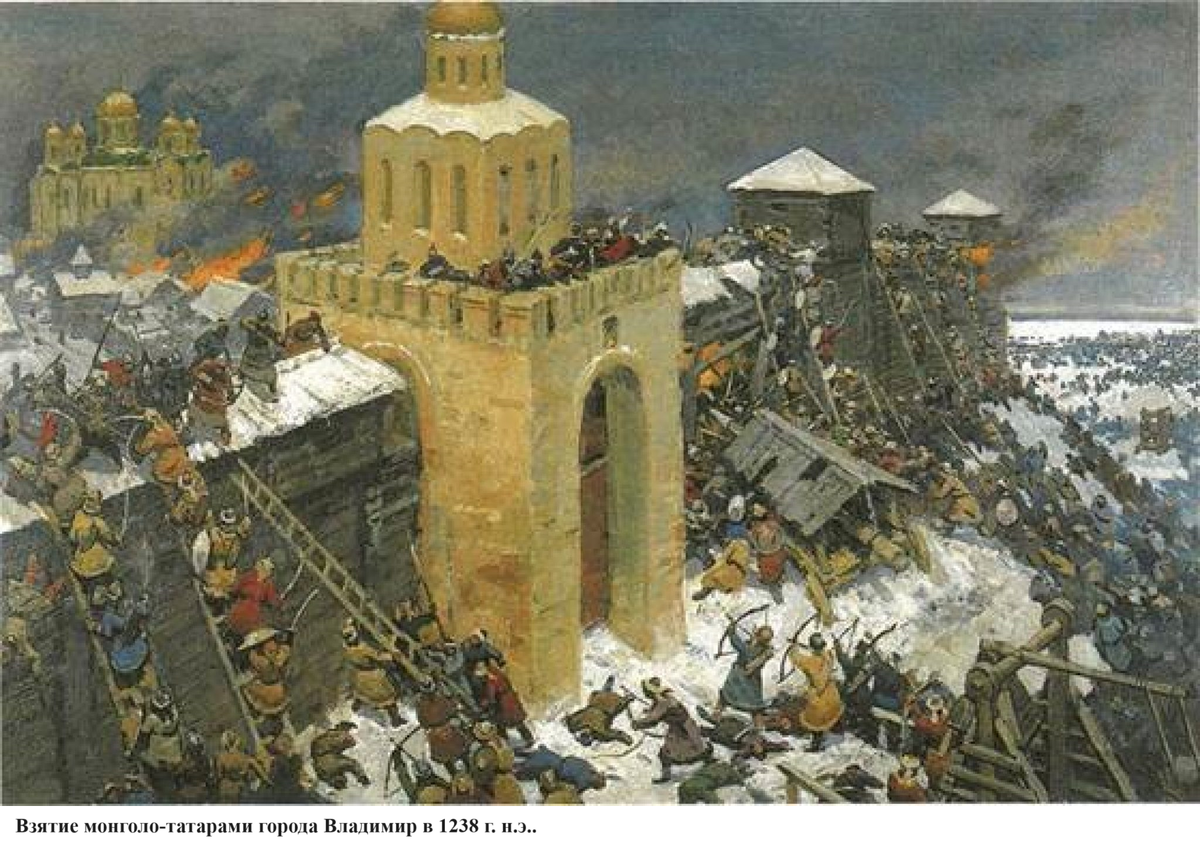 Непрерывные междоусобные войны между удельными наследуемыми князьями не позволили России сплотиться перед лицом монголо-татарского нашествия. Россия потерпела полный крах. Монголо-татары были несравненно более многочисленными, чем половцы и привезли с собою из Китая специальные осадные машины для взятия крепостей. Как в этих условиях вообще русскому народу удалось выжить? Численность русских тогда была уже порядка 10 млн. человек. Уничтожить такой многочисленный народ имевшимся в то время оружием было просто физически очень сложно. России пришлось покориться монголо-татарам. Войска Батыя пришли на Русь в 1237 г. н.э. в начале напав на город Рязань: « И оттолѣ послаша посломъ жену чародѣицу, а съ нею два татарина, въ Рязань къ княземъ рязаньскымъ, просяще у нихъ десятыны: десятого въ князехь, десятого въ людехъ, и въ конехъ, десятаго въ бѣлыхъ, десятаго въ вороныхъ, десятаго въ бурыхъ, десятаго въ пѣгыхъ, и въ всемь десятого». Рязанские князья же послали ответ: «Коли насъ не будетъ всѣхъ, то все то ваше будеть» (там же). Рязань была взята войсками Батыя и разрушена до основания: «И не оста во граде ни един живых, вси равно умроша и едину чашу смертную пиша». («Сказание о разорении Рязани Батыем» Издание ИРЛИ РАН в Интернет). В «Сказании о разорении Рязани Батыем» упоминается герой той войны Евпатий Коловрат: «И некий от велмож резанских имянем Еупатий Коловрат … И приѣха в землю Резаньскую, и видѣ ея опустѣвшую: грады разорены, церкви пожены, люди побьены…. И собра мало дружины тысящу семсот человек, которых Богъ соблюде — быша внѣ града… И внезапу нападоша на станы Батыевы … Татарове мняша, яко мертви восташа! Еупатий силныа полкы татарьскыа проеждяя, бьяше их нещадно. И ездя полком татарскым храбро и мужественно, яко и самому царю возбоятися. … И начаша сѣчи силу татарскую, и многих тут нарочитых багатырей Батыевых побил, ових на полы пресекоша, а иных до седла краяше. … Татарове возбояшеся, видя Еупатия крѣпка исполина. И навадиша на него множество пороков, и нача бити по нем ис тмочисленых пороков, и едва убиша его. … Царь Батый и зря на тело Еупатиево и рече: “О Коловрате Еупатие! Гораздо еси меня подщивал малою своею дружиною! Да многих богатырей сильной орды побил еси, и многие полкы падоша. Аще бы у меня такий служил, держал бых его против сердца своего”. И даша тѣло Еупатево его дружине останочной, которые поиманы на побоище. И веля их царь Батый отпустити, ничем вредити».