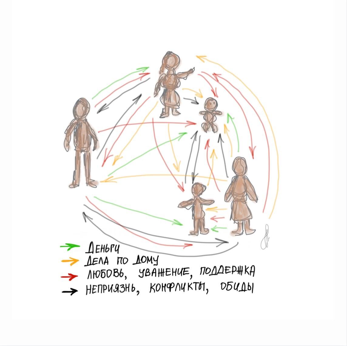 ▪️ Денег (если один из членов семьи платит за другого, покупает ему что-то, оплачивает его расходы — вы рисуете стрелку от платящего к тому, за кого платят).