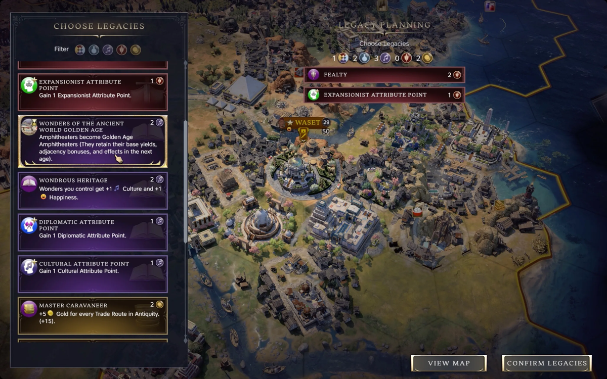 🗓️ Вы можете увидеть требования для разблокировки будущих цивилизаций, а также список открытых вариантов наследия для следующей эпохи, нажав на значок замка в верхней части экрана.