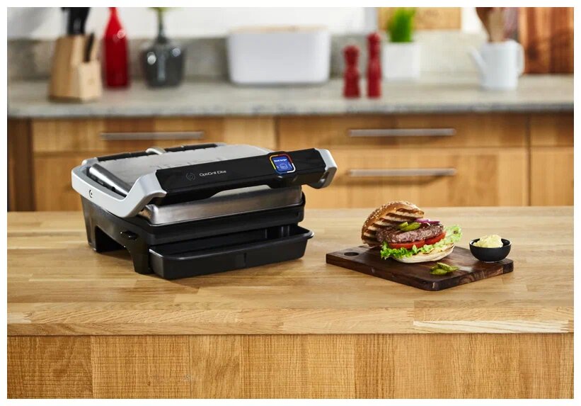Электрический гриль OptiGrill Elite GC750D30 от Tefal — это умное устройство, которое облегчит приготовление идеальных стейков и множества других блюд. С его помощью вы сможете приготовить сочное мясо любой прожарки без особых усилий. Основные особенности гриля: 1. Автоматическая настройка температуры и времени: Гриль автоматически определяет толщину продукта и устанавливает нужные параметры для идеальной прожарки. Процесс контролируется специальным индикатором, который показывает степень готовности блюда. 2. Удобство использования: Инновационный индикатор позволяет отслеживать процесс приготовления и получать уведомления о каждом этапе. Всё сделано для максимального удобства пользователя.3. Многофункциональность: OptiGrill подходит для приготовления рыбы, мяса, птицы и овощей. Достаточно загрузить продукты, и гриль выполнит всю работу самостоятельно. 4. Ресторанная корочка: Функция Searing Boost создаёт на мясе аппетитную золотистую корочку с тёмными полосами, придавая блюду ресторанн