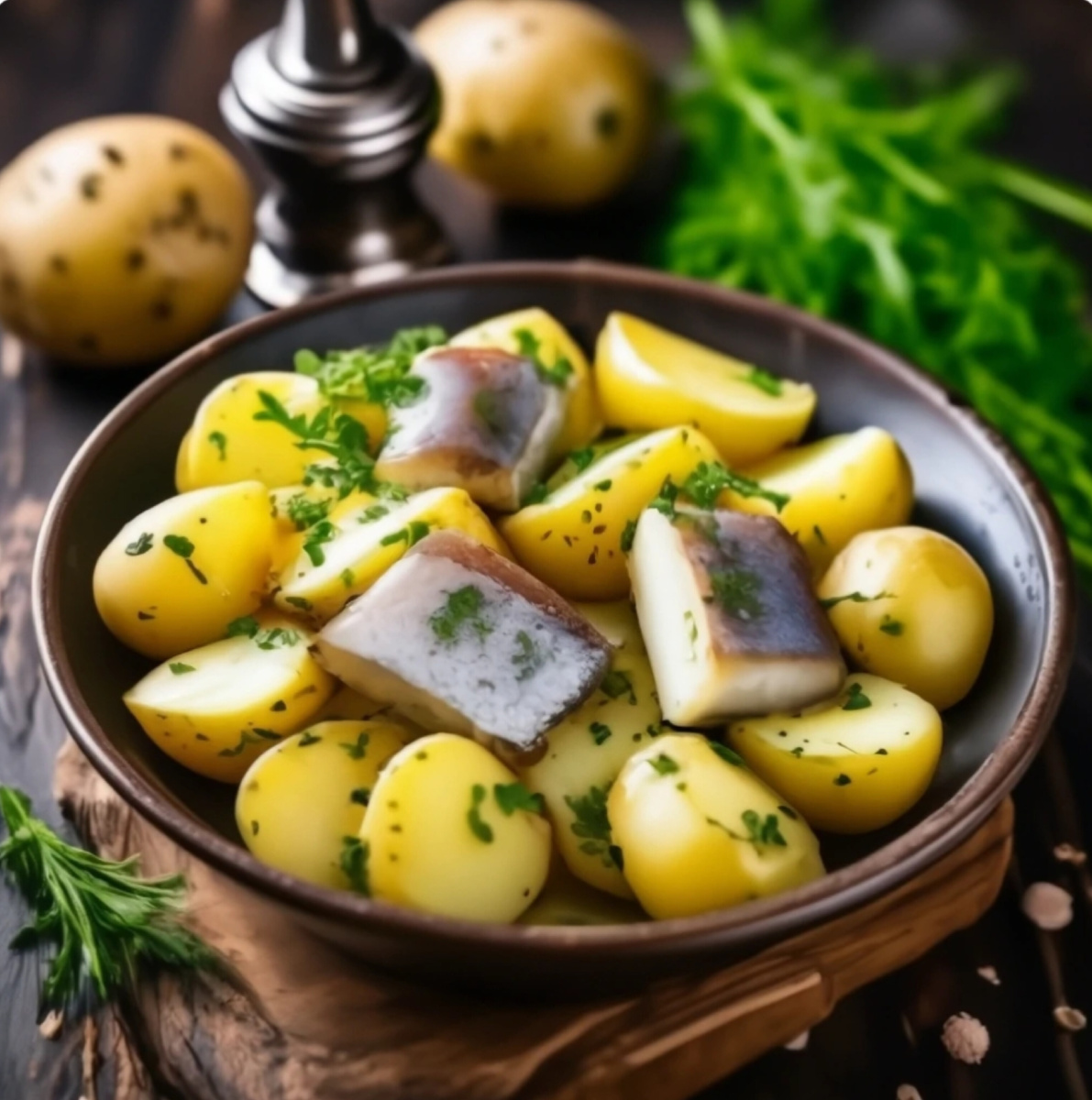 Отварная картошка с зеленью, луком и селедкой - это одно из самых популярных блюд русской кухни. Оно готовится быстро и просто, но при этом получается очень вкусным и питательным. Ингредиенты: - Картофель - 5-6 штук; - Лук репчатый - 1 штука; - Сельдь соленая - 200 грамм; - Укроп свежий - 1 пучок; - Соль - по вкусу; - Перец черный молотый - по вкусу. Приготовление: 1. Картофель очистите от кожуры, нарежьте кубиками и отварите в подсоленной воде до готовности. 2. Лук мелко нарежьте и обжарьте на сковороде до золотистого цвета. 3. Селедку нарежьте мелкими кусочками. 4. В глубокую тарелку выложите отварной картофель, обжаренный лук, нарезанную селедку и мелко нарезанный укроп. Посолите и поперчите по вкусу. Перемешайте все ингредиенты. 5. Подавайте блюдо горячим или холодным, украсив свежей зеленью. 6. Селедку можно подать отдельно. Приятного аппетита !