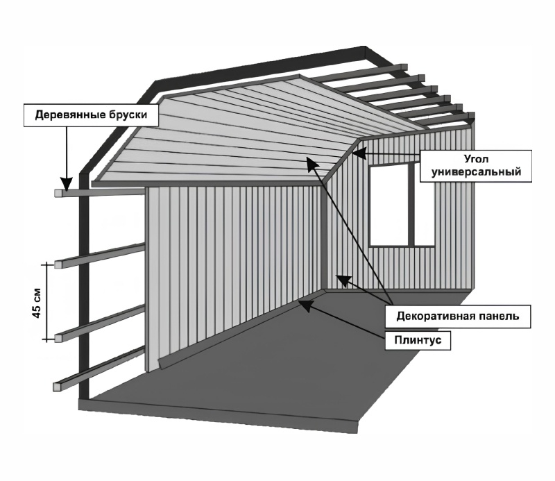 • молоток: • карандаш; • гвозди или монтажные скобы: • пила по дереву с мелким зубом; • инструмент для угловой прирезки под 90°; • отвес или уровень; • стеновые панели; • угол универсальный; • наличник декоративный (при необходимости). • Помещение должно быть сухим и отапливаемым с температурой воздуха от + 10°С до + 40°С и относительной влажностью не более 70%. • Вскрытые упаковки панелей должны находиться в помещении, предназначенном под отделку, не менее 48 часов. • Стены необходимо обшить брусками (сечением не менее 20х40 мм) перпендикулярно монтируемой панели, как показано на рисунке. Расстояние между брусками должно быть не более 45 см. Тип соединения панелей-«шип-паз», фуга «О». 1. Монтаж панелей начинать от угла помещения. 2. Первую панель прибить со стороны шипа к угловым брускам на расстоянии, позволяющем скрыть гвоздь универсальным углом. 3. Со стороны паза прибить панель к брускам гвоздями или пристрелить скобками. 4. В паз первой панели вставить до упора шип второй пане