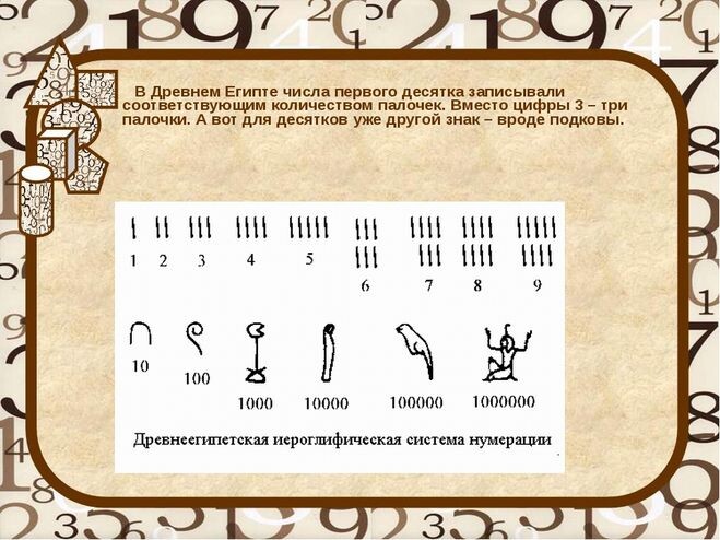 История происхождения цифр, как в общем-то и письменности, будоражит умы многих ученых. Основные вопросы, которые волнуют общественность и на которые до сих пор нет однозначного ответа, делятся на три категории: · Кто придумал письменность? · Для чего создали письменность и зачем в нее добавили цифры? · Каким временем датируются эти изобретения? В чем мы точно можем быть уверены, так это в том, что общепринятой системой исчислений сегодня считается арабская с уже ставшими, как родные, цифрами, единицами и нулями. Но так было не всегда. На протяжении многих тысячелетий числа и способы счета в разных цивилизациях развивались по-разному. Первые археологические упоминания численности относятся к эпохе Древнего Египта. Для обозначения цифр египтяне использовали символы и иероглифы. Например, для единицы использовался символ палочки, для десяти - рисунок изогнутой линии, а для тысячи - символ лотоса. В Древнем Египте, также, как и сегодня использовали десятичную систему. Единицы, десятки, со