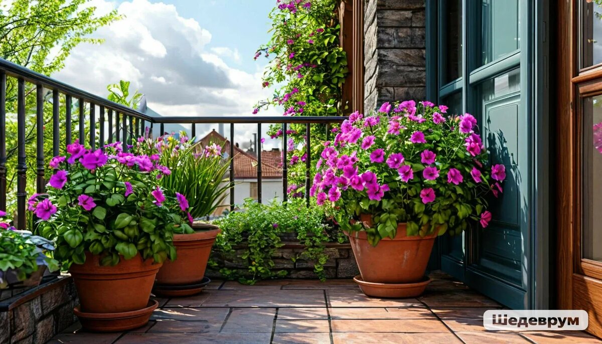 Петуния — одно из самых популярных растений для балконов и террас. Её яркие цветы, которые могут быть самых разных оттенков — от белого и розового до фиолетового и синего, — создают атмосферу праздника и радости. Петуния цветёт с начала лета до поздней осени, что делает её идеальным выбором для тех, кто хочет наслаждаться красотой балконного сада как можно дольше.