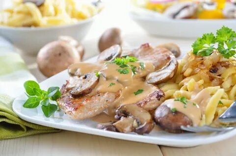 Ингредиенты: 500 г картофеля; 200 г шампиньонов; 1 луковица; 200 мл сливок (20%); 50 г сливочного масла; соль, перец, зелень (по вкусу). Приготовление: Картофель очистить и нарезать кубиками или ломтиками. Грибы промыть, нарезать пластинками. Лук очистить и нарезать полукольцами. В сковороде разогреть сливочное масло, обжарить лук до прозрачности. Добавить грибы и жарить, помешивая, 5-7 минут. Добавить картофель, перемешать. Жарить на среднем огне, периодически помешивая, до полуготовности картофеля. Влить сливки, посолить, поперчить, перемешать. Тушить на медленном огне под крышкой 5-7 минут, до готовности картофеля. Перед подачей посыпать зеленью. Это блюдо отлично сочетается с овощным салатом или соленьями.
