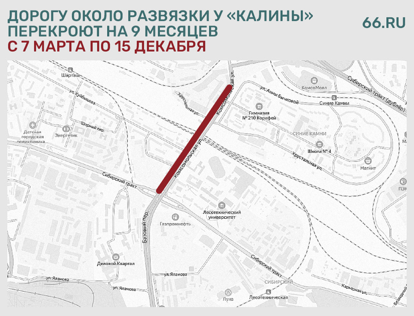 Четную строну Комсомольской перекроют с 7 марта до 15 декабря. Движение закрывают для строительства развязки у «Калины», сообщил телеграм-канал «Екатеринбург. Главное». Объехать можно по уже готовым эстакадам. Первую открыли в сентябре 2023 года, а вторую — в январе этого.