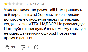 Есть крутой инструмент, чтобы понять - а чего вообще надо моим клиентам? Он называется отзывы. И лучше всего – отзывы негативные. Если у вас таких нет (очень надеюсь), то можно почерпнуть их у ваших нерадивых конкурентов. Открываем Яндекс.Карты/2Гис, находим другие компании по ремонту и видим: