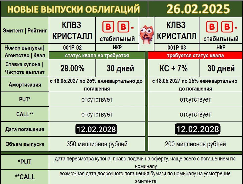 🛌 Доооооброе, друзья! Вылезать не хочется из кровати, но новинки сами себя не представят! Тем более, что сегодня представлены достаточно разнообразно. ✅ Вновь два выпуска от одного и того же эмитента на низком старте - в районе 16:30 по Москве встречайте в стакане. Стакан, кстати, как никогда актуален :) 〰️〰️〰️〰️〰️〰️〰️〰️〰️〰️ 🥃 КЛВЗ КРИСТАЛЛ 001Р-02 📊 🅱️🅱️➖ 🔹 ISIN: $RU000A10AZG2 ▪️ Купон фиксированный: 28,00% ▪️ Без оферт и досрочного погашения ▪️ Амортизация по 25% в 27, 30, 33 и 36 выплату ▪️ Погашение через 3 года 🥃 КЛВЗ КРИСТАЛЛ 001Р-03 📊 🅱️🅱️➖ 👨🏫 Только для квалов 🔹 ISIN: $RU000A10AZF4 ▪️ Купон плавающий: КС + 7% ▪️Значение КС фиксируется за 7 рабочих дней до нового купонного периода ▪️ Без оферт и досрочного погашения ▪️ Амортизация по 25% в 27, 30, 33 и 36 выплату ▪️ Погашение через 3 года ▪️ Рейтинговый отчет: ➖ https://ratings.ru/ratings/press-releases/klvzk-RA-221024/ (22.10.2024) —————— 🏦 Финансовые показатели группы (за 9 месяцев 2024 года): 💬 В скобках