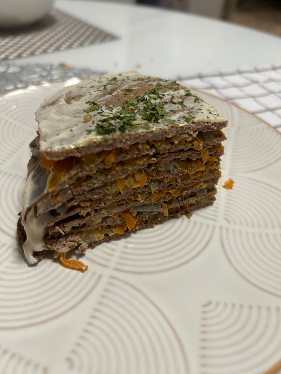 Печеночный торт- это вкусно и полезно! Конечно, я не могла и тут не поделится рецептом. Те, кто подписаны на мой ТГ-канал уже видели рецепт, оценили и залайкали))) Добавлю в свою Копилку, может кому пригодится. Для блинчиков: Для начинки: Для крема: 1) Смешать все ингредиенты для блинчиков и взбить блендером; 2) На сухой сковороде пожарить блинчики печеночные; 3) Мелко нарезать лук; 4) Морковь потереть на терке; 5) Обжарить лук и морковь до мягкости на небольшом количестве подсолнечного масла; 6) Для соуса смешать сметану, соевый и горчицу, добавить чеснок и зелень по вкусу; 7) Выложить печеночный тортик слоями, чередуя блинчик, крем, начинка. 8) Украсить по желанию. КБЖУ на 100 гр.: 159 / 11,5 / 8,1 / 9,5 ПРИЯТНОГО АППЕТИТА!!!