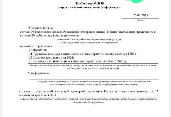 На этот вопрос всегда хочется сказать: да какая разница. Ибо, в большинстве случаев, такие требования неправомерны, но только проку с этого никакого. Потому что, если в рамках камеральной проверки запрашивается кипа документов, то вопрос должен стоять уже по-другому: как сделать так, чтобы следом не получить быстрые, как работа халтурщика, доначисления? Рассмотрим на примере требования, которое подписчик выкладывал тут вчера (потом ушёл с ним на наш закрытый ТГ-канал) - оно на фото. Ок, гугл, оно неправомерно. Потому что в рамках камеральных проверок у налогового органа - используй он хоть требование по ст. 88 НК РФ, по ст. 93 НК РФ - в общем случае, нет права требовать документы (за исключением ряда специальных случаев, но обычная камералка обычного РСВ к ним не относится). У инспекции есть право требовать в рамках КНП пояснения, но и то, строго говоря и буквально читая п. 3 ст. 88 НК РФ, только в случаях, когда она нашла какие-то несоответствия (расхождения) данных, и указала на н