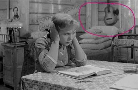Те, кто родом из СССР, наверняка помнят моду повязывать банты на гитары (акустические, семиструнные…). Причем часто инструмент не убирали подальше в чехол, а вешали на стену комнаты, иногда рядом с другими вещами, которые хозяева считали знаковыми. Допустим, у героинь советской комедии «Девчата», которые жили в общежитии, днем работали, а потом учились в вечерней школе, гитара висела по соседству с портретом Александра Пушкина… вот такими культурными были юные строительницы нового общества: Вообще мода на такие банты на гитарах пошла как минимум с XIX в. Повязывая ленточку на гриф, любители музицировать старались показать свое чувство вкуса и определенную продвинутость. Была, впрочем, противоположная оценка: иногда бант на гитарах считали признаком мещанства наряду с геранью на окне и с канарейкой в клетке. Промежуточная позиция гласила: банты более подобают слабому/прекрасному полу, а для мужчин они недостаточно брутальны (в терминах нашего времени). Скажем, в «Жестоком романсе», этой