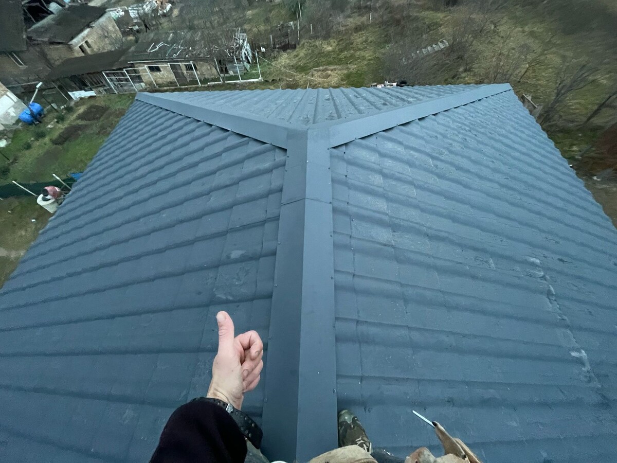 Добрый день, друзья! Завершили кровельные работы в Крыму, в селе Голубинка. Мы сделали стропильную систему, кровлю из металлочерепицы, заказчики выбрали цвет серый графит и тип волны «дюна», а так же подшили карниз перфорированным софитом Дёке и установили водосточную систему Дёке премиум и утеплили потолок по балкам.