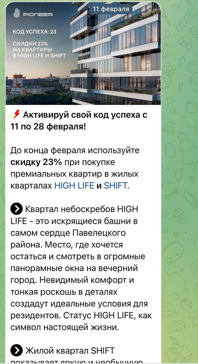 Как оказалось, потерять деньги благодаря покупке квартиры у Застройщика можно, даже не заключив договор долевого участия. И так 11 февраля Застройщик Pioneer опубликовал новую акцию это - 23% скидка к 23 февраля если покупатель оплачивает квартиру полностью и выходит на подписание договора долевого участия до 28 февраля. Акция распространялась на два премиальных проекта : Жилой комплекс Shift и ЖК High Life. Надо признать , что цены для этих проектов были очень интересные и в первый же день акции пошли брони. Стоимость бронирования в проекте 50 000 рублей. Забронировано было практически 50 квартир. 20 февраля, то есть за 8 дней до окончания акции покупателям сообщают что брони аннулированы у тех дольщиков, которые не успели выйти на сделку, а это было более 40 квартир ‼️, эти квартиры будут выставлены на 15 - 20% и более дороже. О Причине Застройщик сообщил, что просчитался со стоимостью квартир, и эти цифры не бьются с фин. моделью. Покупайте по новой цене или вернем бронь 50 000 рубл