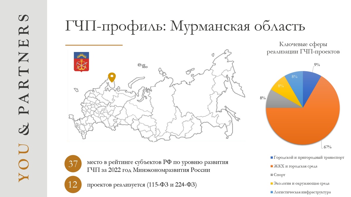 Сегодня команда You & Partners рассмотрит ГЧП-Профиль региона Мурманская область. 🏆Место в рейтинге Согласно итоговой оценке рейтинга субъектов РФ по уровню развития ГЧП за 2022 год (Минэкономразвития России), Мурманская область занимает 37 место (спустившись на 33 позиции по сравнению с 2021 годом). 📄Региональные НПА Среди актов регионального законодательства следует выделить: Закон Мурманской области от 11.01.2011 №1315-01-ЗМО «О государственной поддержке инвестиционной деятельности на территории Мурманской области». Закон устанавливает принципы государственной поддержки инвестиционной деятельности на территории Мурманской области, полномочия органов государственной власти Мурманской области в сфере осуществления государственной поддержки инвестиционной деятельности на территории Мурманской области, а также формы государственной поддержки инвестиционной деятельности. Постановление Правительства Мурманской области от 23.07.2014 №386-пп «Об утверждении Порядка рассмотрения инвести