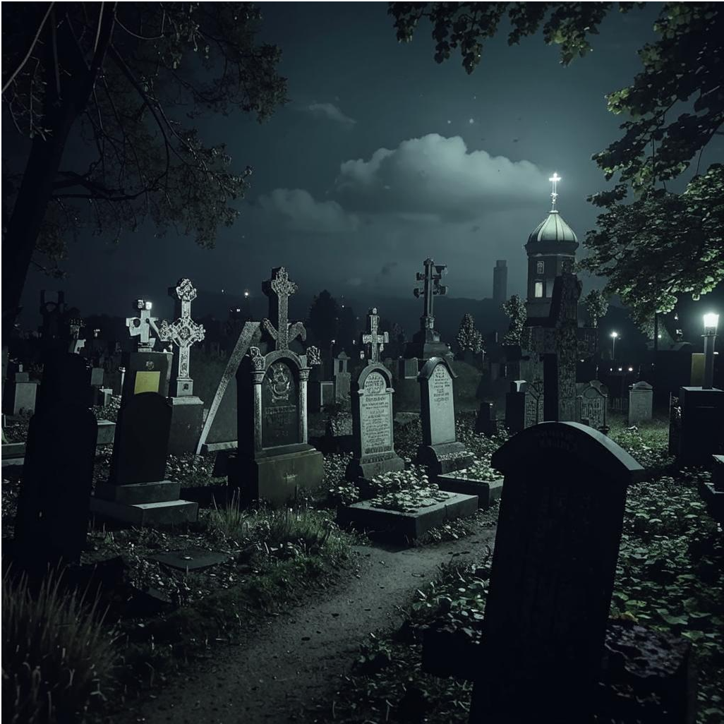 Мы стояли на краю старого кладбища, где тени деревьев сливались в одну чёрную массу, а луна, словно насмехаясь, бросала бледный свет на надгробия, давая лишь иллюзию видимости. Я чувствовал, как холодный пот стекает по спине, хотя ночь была тёплой, я бы даже сказал уютной. Макс, мой друг детства, всегда был тем, кто тянул меня в авантюры и помогал находить приключения на пятую точку. Но вся эта затея — ночная вылазка на заброшенное кладбище — была самой глупой из всех его гениальных идей.