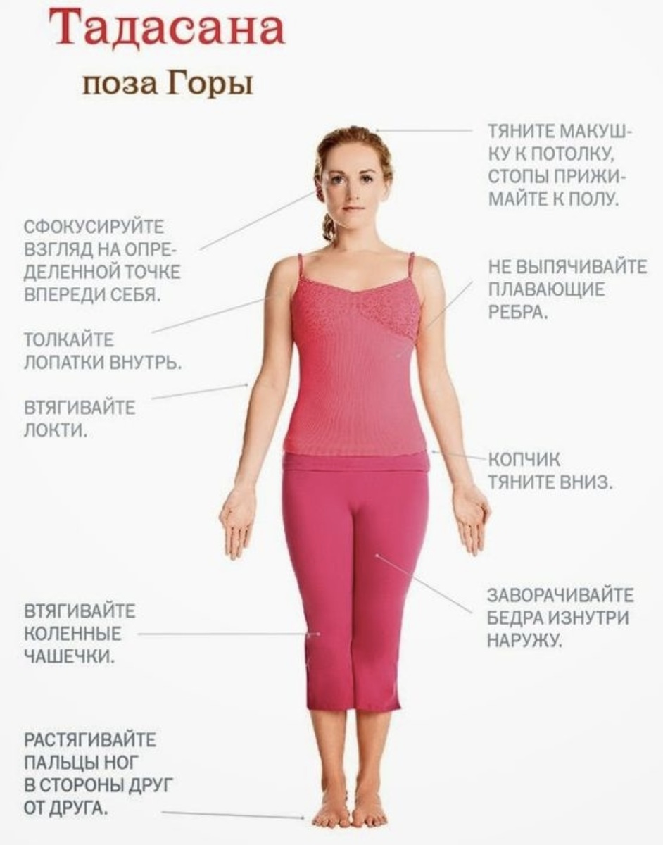 - Как выполнять: Встаньте прямо, соедините стопы, вытяните позвоночник вверх, расслабьте плечи. Дышите глубоко и ровно.