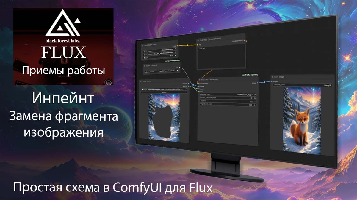 Инпейнт в нейросетя - это процесс замены фрагмента исходного изображения путем его перегенерации. Покажу вам очень простую схему такого инпейнта на модели Flux. На своем канале я делюсь с вами различными техниками работы с нейросетями. Это очередной урок про приемы работы с суперпопулярной на сегодня моделью Flux. Используем полностью бесплатную программу ComfyUI В чем заключается основная идея процесса инпейнта? Вы берете исходное изображение и выделяете тот фрагмент, который хотите заменить. При этом формируется специальная маска, которая открывает для генерации только выделенную вами область. Затем вы пишете промт и выполняете генерацию. При этом выбранный вами фрагмент перегенерируется заново, и на его месте появляется новое изображение. Эта замена может быть как небольшой, так и очень значительной. Т.е. вы можете изменить цвет одежды персонажа, например. А можете вместо пары кустов в лесу нарисовать волшебный замок. И как вы понимаете, ключевая задача качественного инпейнта так