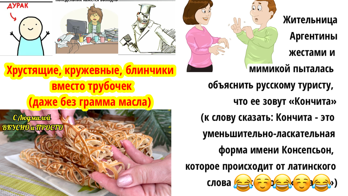 — Как к тебе проехать? — Да просто. Въехал в город, слева будет «Валдбериз», от него два квартала, потом поворот налево, возле «Валдбериз». Там по прямой до светофора, и направо, поворот за «Валдбериз», потом еще квартал, там увидишь пятиэтажку, я там живу, а на первом этаже «Валдбериз». — Жесть!!! А у вас в городе есть другие ориентиры, кроме «Валдбериз»? — Конечно есть! Въезжаешь в город, справа будет «ОЗОН»… /анекдот для хорошего настроения/ Сегодня у меня для вас интересный рецепт хрустящих, кружевных блинчиков, которые по вкусу очень сильно напоминают трубочки. Но в тесто для трубочек, чтобы они были хрустящие, обычно добавляют много сливочного масла. В этих блинчиках нет ни грамма масла, а получаются они хрустящие. К тому же пекутся они на сковороде без использования электровафельницы. 🔥 А чтобы приготовление еды не было скучным, в конце публикации и в закреплённом комментарии ⤵️⤵️⤵️ вас ждут весёлые картинки (фотографии) с надписями, которые я сделала сама (используя нейросе
