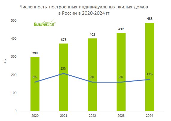 В 2020-2024 гг число построенных индивидуальных жилых домов в России возросло на 64%: с 299 до 488 тыс.