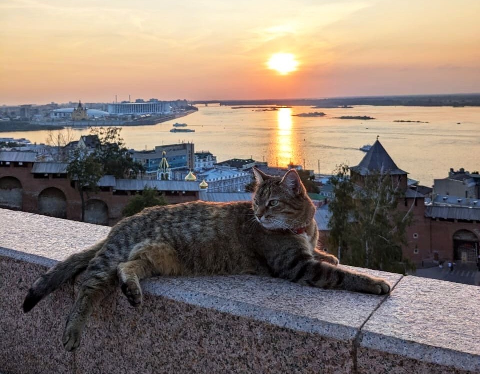 Кстати, именно здесь можно любоваться теми самыми нижегородскими закатами. Вот они не разочаровали! Действительно — просторы такие, что закат можно наблюдать от и до, пока совсем темно не станет. Ещё очень позабавил местный кот. Разлёгся прямо на фоне заката — целая толпа туристов сбежалась его фотографировать.