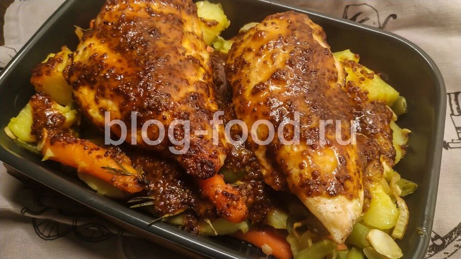 Всем привет. Сегодня у нас яркое и вкусное блюдо на любой случай. Готовится быстро, выглядит красиво, на вкус оригинально, так что и в будни и в праздники будет в самый раз. Продуктовый набор: Листочки розмарина отделяем от стеблей, лук нарезаем полукольцами. Картошку чистим, нарезаем произвольными ломтиками, кладём в кипяток, солим, отвариваем 15 минут... ...смешиваем в миске с миндальными хлопьями, фасолью, морковью и парой ложек растительного масла. В сотейник вливаем яблочный уксус, 5 ст. ложек растительного масла, добавляем мёд, горчицу паприку, соль по вкусу, прогреваем, помешивая, полминуты на сильном огне. Курицу солим, перчим по вкусу, обжариваем по паре минут с каждой стороны на сильном огне, откладываем в сторону. На сильном огне обжариваем лук в течение минуты, добавляем к овощам, солим по вкусу, перемешиваем. На дно формы выкладываем овощи, сверху курицу, поливаем медово-горчичным соусом, отправляем в разогретую до 180°С духовку на 15 минут. Подаём. Приятного аппетита!