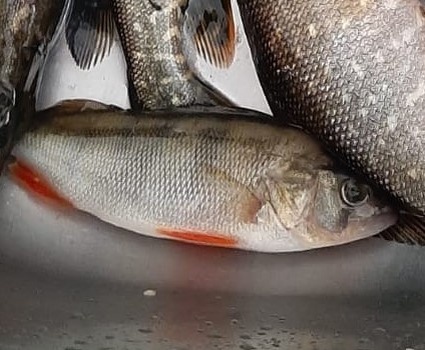 Выметав икру, стаи оголодавших окуней первое время бродят около берега на небольшой глубине и кормятся главным образом икрой других рыб, особенно икрой плотвы, которая нерестится вскоре после окуня, также земляными червями, принесенными в реку или пруд с пашен и огородов.
