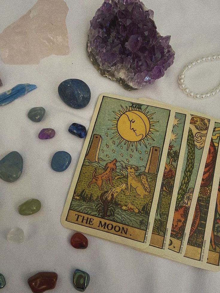 Изображение аркана представляет собой залитый лунным светом пейзаж с двумя башнями по обе стороны, извилистой дорожкой, ведущей вдаль, и бассейном с водой на переднем плане. Луна светит над головой, часто с изображением лица, отбрасывая на сцену жутковатый свет. Рак выходит из воды на сушу, символизируя подсознание и процесс трансформации. Также присутствуют волк и домашняя собака, представляющие дикий и ручной аспекты психики. Образы карты предполагают таинственное, сказочное царство, где все может быть не таким, каким кажется, вызывая чувства интуиции, иллюзии и исследования подсознания. Луна: Символ интуиции, эмоций, снов и бессознательного, изображаемый в трех фазах – полнолуния, полумесяца и полумесяца. Человеческий профиль на Луне: Это разум. Но глаза человека закрыты, то есть разум спит. Бассейн с водой: Эта безмятежная и отражающая поверхность приглашает нас погрузиться в глубины нашего подсознания, где обитают скрытые мысли, чувства и желания. Домашняя собака и Дикий Волк: