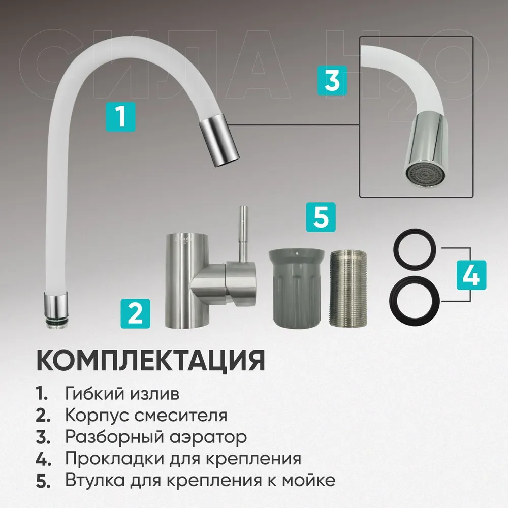 - Гибкий излив: Силиконовый излив легко сгибается и возвращается в исходное положение, что позволяет направлять поток воды в нужном направлении. Это особенно удобно в процессе готовки и уборки.