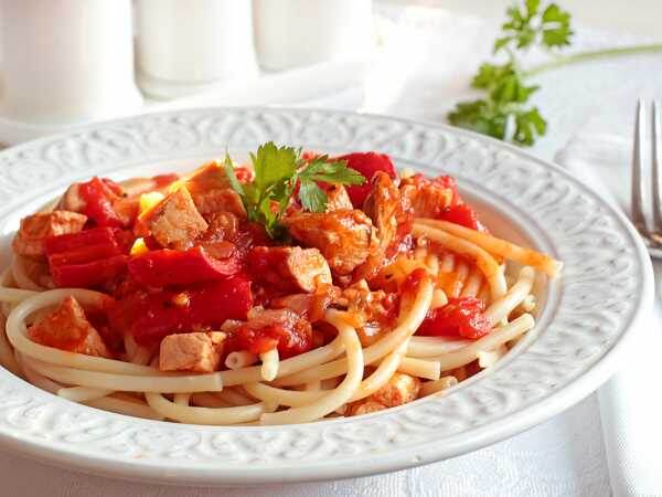 Вот рецепт вкусного и питательного блюда — паста с томатным соусом и курицей: Ингредиенты: 250 г пасты (макаронных изделий); 300 г куриного филе; 1 луковица; 2 зубчика чеснока; 400 г томатов в собственном соку; 1 столовая ложка томатной пасты; специи (соль, перец, базилик, орегано, сахар) — по вкусу; оливковое масло для жарки. Отварите пасту в подсоленной воде до состояния альденте (на 1-2 минуты меньше, чем указано на упаковке). Пока паста варится, нарежьте куриное филе небольшими кусочками. Лук нарежьте полукольцами, чеснок измельчите. Разогрейте сковороду с оливковым маслом и обжарьте лук до золотистого цвета. Добавьте к луку куриное филе и обжаривайте, пока мясо не побелеет. Добавьте измельчённый чеснок и обжаривайте ещё 1 минуту. Откройте банку с томатами, слейте сок в отдельную ёмкость. Добавьте к курице томаты в собственном соку и томатную пасту, перемешайте. Приправьте соус специями по вкусу, добавьте сахар, если томаты кислые. Тушите соус на среднем огне, пока он не загустеет
