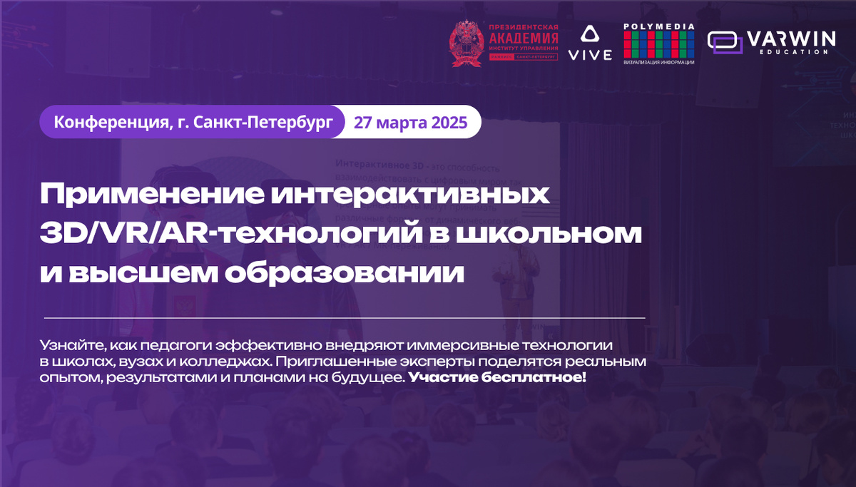 27 марта 2025 года в Санкт-Петербурге пройдет конференция «Применение интерактивных 3D/VR/AR-технологий в школьном и высшем образовании». Это уникальная возможность для педагогов, руководителей образовательных организаций и всех, кто интересуется инновациями в обучении, погрузиться в мир 3D/VR/AR-технологий и узнать, как они меняют образовательный процесс. Участие бесплатное!