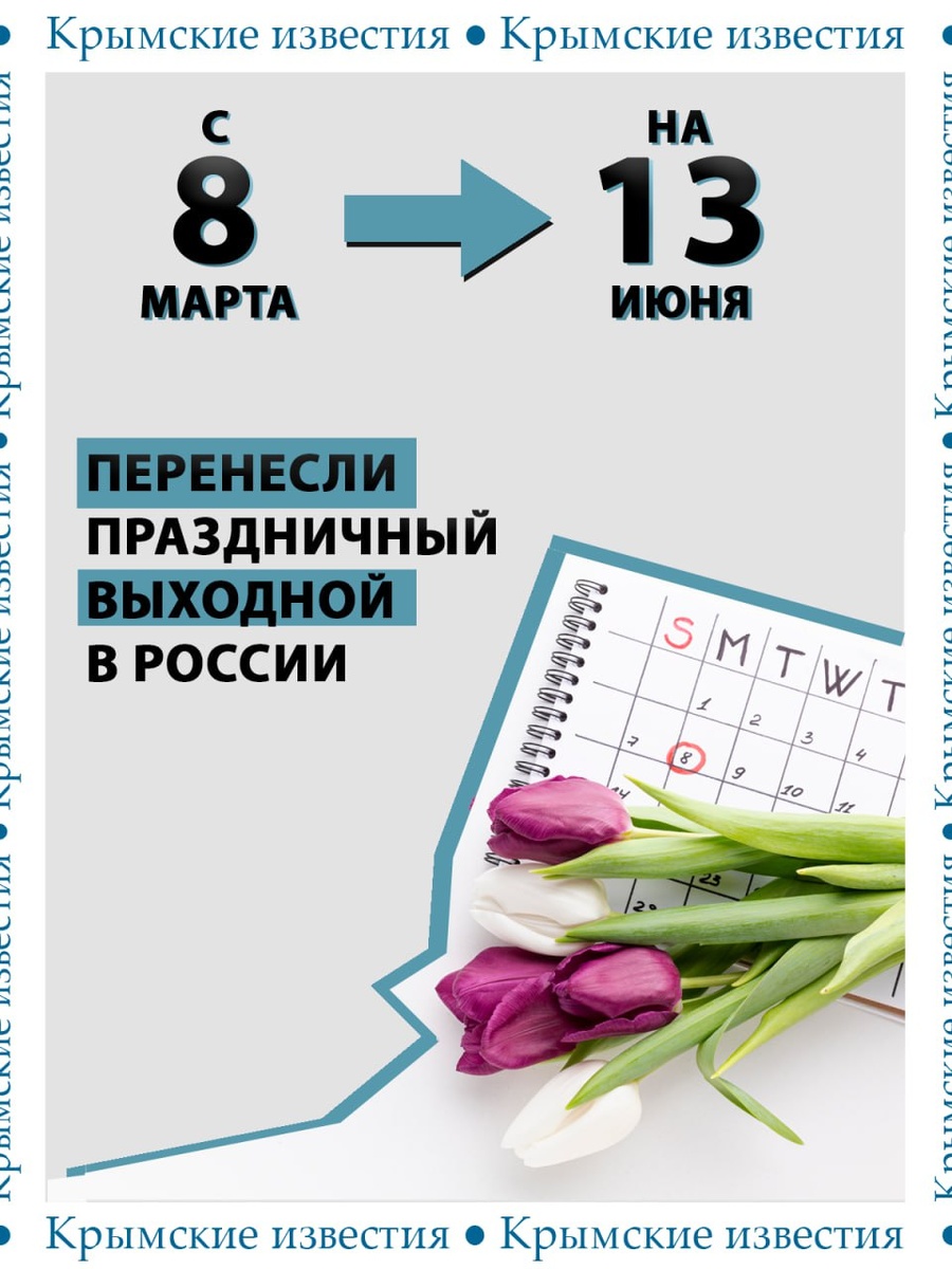 Выходной с субботы, 8 марта, перенесли на пятницу, 13 июня. В этом году длинных выходных в честь Международного женского дня, который выпадает на субботу, не будет. Вместо этого россияне будут отдыхать 13 июня, сообщили в Минтруда РФ. При этом пятница, 7 марта, будет коротким днём – продолжительность работы сократят на час. Ранее сообщалось, что крымчан в этом году ждут четыре дополнительных нерабочих дня в связи с религиозными праздниками. Крымские известия. Больше новостей Telegram | ВКонтакте | Одноклассники