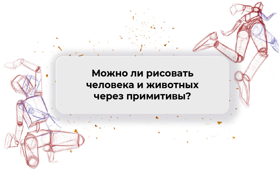 Здесь очень часто путают логику: у живых существ примитивы мы находим не в основе строения, а мы в эти примитивы вписываем формы самостоятельно. В основном как раз для того, чтобы помочь себе передать перспективу и сокращение в сложном ракурсе. Но ну путайтесь: живые существа не состоят из простых форм 😉 Мы их к ним можем привести.