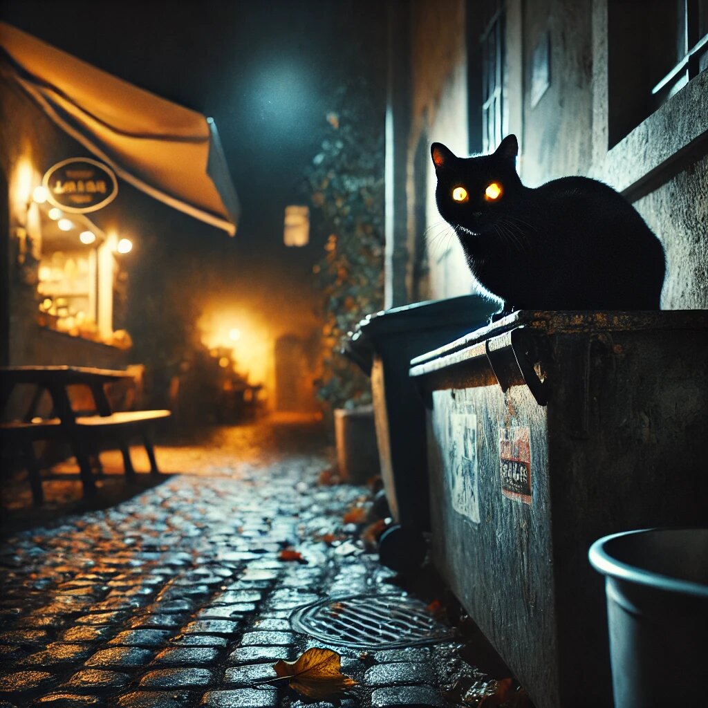 Я прислушался. Глаза привыкли к темноте, и вот – увидел: на краю мусорных баков сидела кошка. Черная, как сама ночь, только глаза – два желтых светящихся огня. Голодная, настороженная.