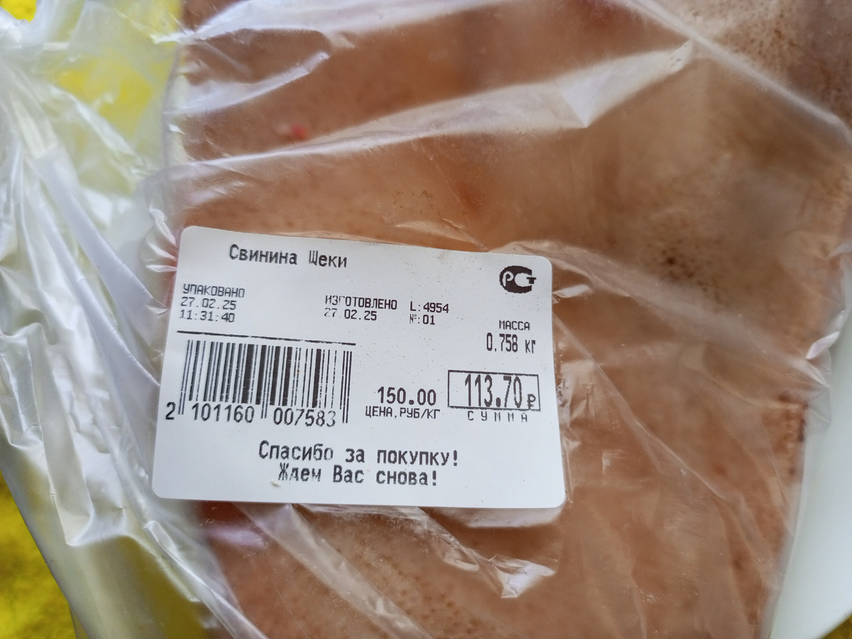 Для начала ищем в магазине и покупаем щечку от хрюшки. При цене 150р кг, щека потянула на 113р. Примерно так она выглядит без пакета. Нарезаем на сковородку примерно так как на фото или как вам больше нравится. Нарезаем морковь крупным брусочком и много лука кубиком. Отправляем все это к свининке. Тушим на огне ниже среднего примерно 45-60 минут, предварительно добавив стакан воды. Соль, перец, копченая паприка по вкусу. Вот она красавица, все готово, к столу! Приятного аппетита =)